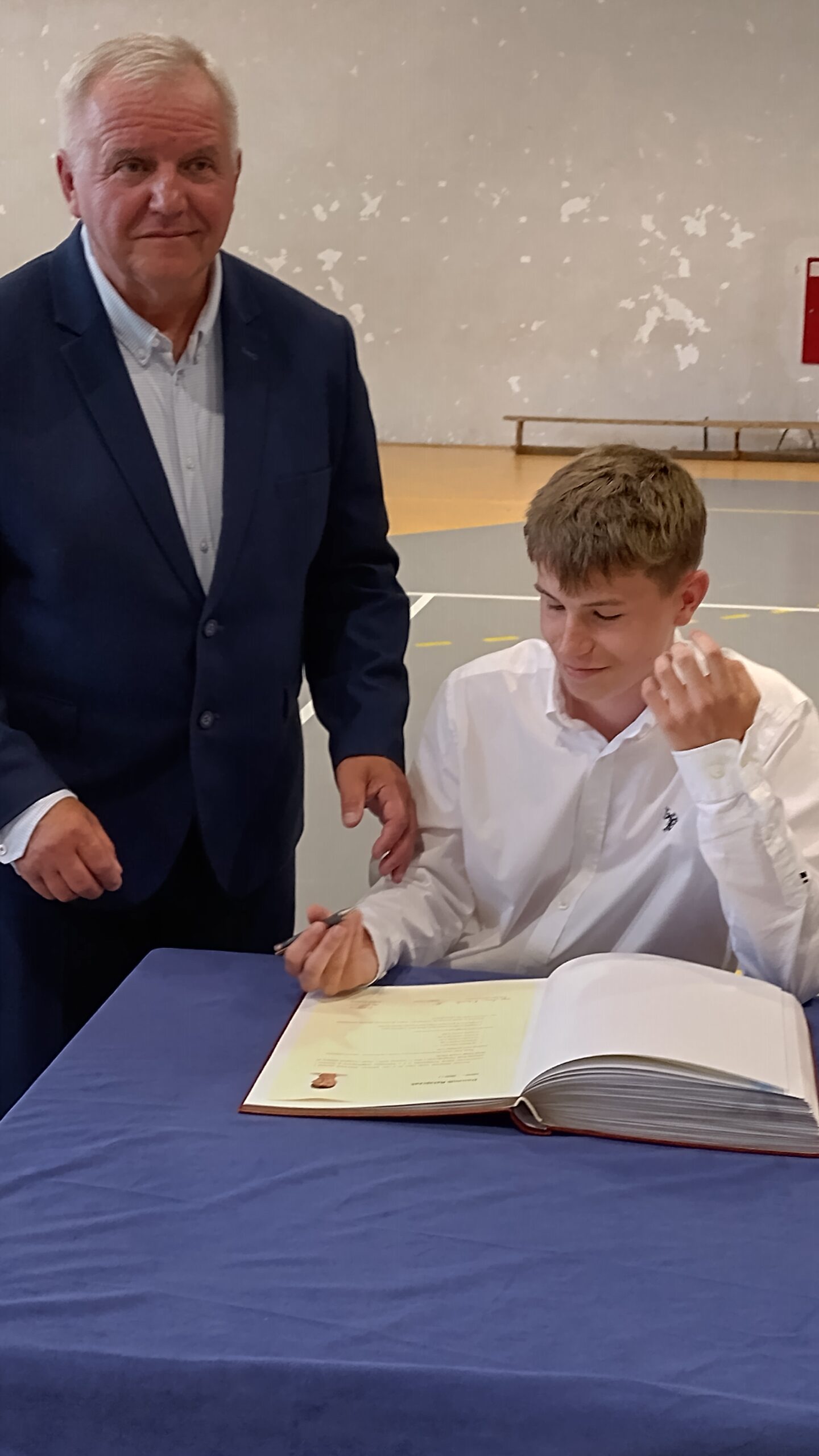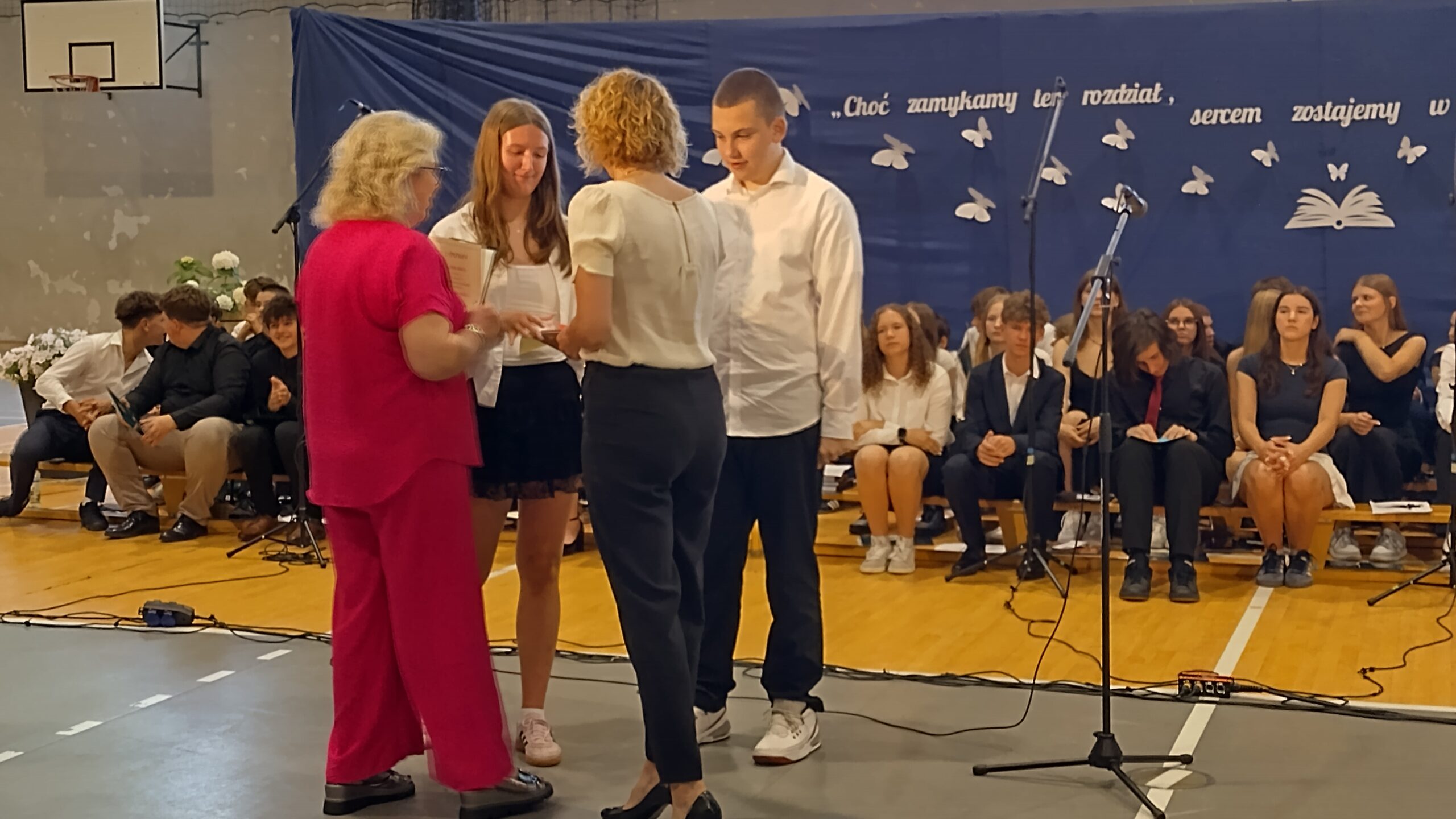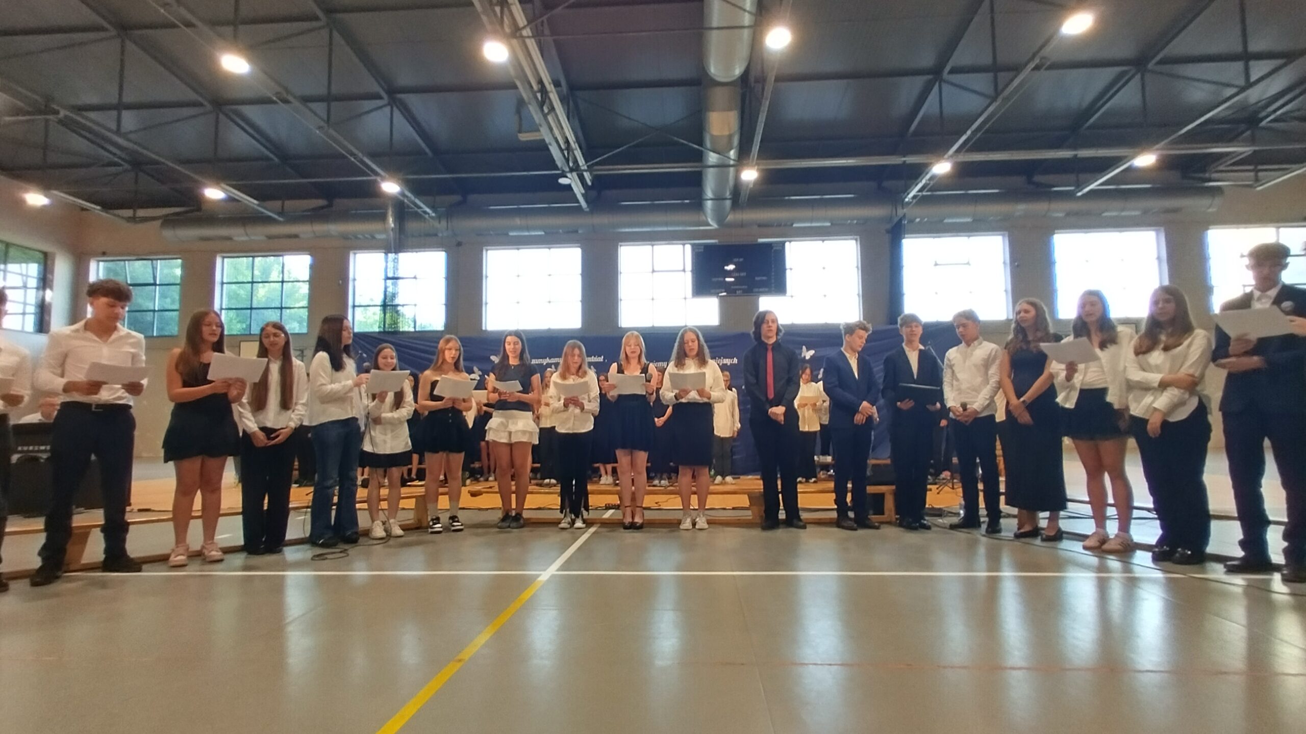 26 czerwca 2025 roku o godzinie 16.00 rozpoczęła się uroczystość zakończenie nauki przez klasy VIII. Część oficjalną otworzył dyrektor szkoły Marek Durczak, a list z gratulacjami dla absolwentów od Burmistrz Jarocina Urszuli Wyremblewskiej Korzyniewskiej odczytała radna Katarzyna Wyderkiewicz. Do życzeń dołączyła się również przewodnicząca Rady Rodziców naszej szkoły Edyta Szymandera. Podczas części oficjalnej nastąpiło przekazanie sztandaru nowym pocztom. Aleksandra Moskalik z klasy VIII a oraz Dominik Ratajczak z klasy VIII d zostali uhonorowani wpisem do Złotej Księgi szkoły. Następnie pedagog szkolna Ewa Król wraz z Edytą Szymanderą wręczyły nagrodę „Wystrzałowy uczeń” i „Kolega na medal”. Nagrodzono również najlepszych siatkarzy, zespół aerobiku oraz młodzież działającą w Samorządzie Uczniowskim. Część oficjalną zakończono wręczeniem świadectw z wyróżnieniem oraz podziękowań dla rodziców. W części artystycznej młodzież zaprezentowała swoje talenty sceniczne, a każdemu uczącemu ich nauczycielowi wręczono pamiątkowy bilet lotniczy.